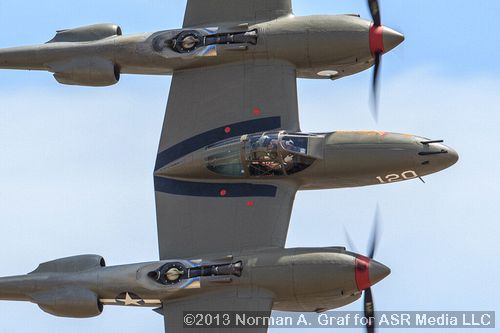 “Lightning Strikes Chino!” was the theme for the 2013 Planes of Fame Museum’s airshow, which featured five of the seven flying P-38s in the world. Over 40 warbirds in the air with many more on static display (including several rare or unique aircraft), great aerobatic performers, and numerous veterans sharing their wartime experiences combined once again to make this one of the best airshows in North America. The overall schedule for the airshow is roughly the same from year to year, featuring WWII Pacific, WWII European and Korean air war demonstrations, civilian aerobatic displays, and a flying performance highlighting the specific year’s theme. However, the mix of individual aircraft changes constantly. The one thing which never changes is the large number and variety of aircraft and the almost constant flying, both in formations and individual flybys. |