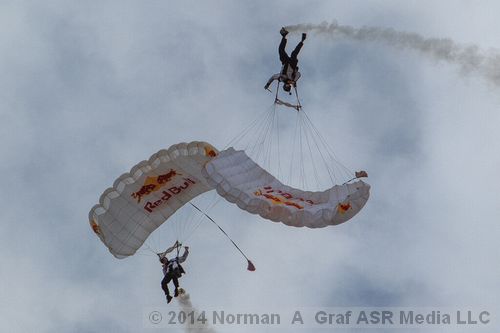 | The skies were once again filled with parachutes when the Golden Knights returned for their full demonstration. This was composed of a number of intricate maneuvers including a simulated fouled chute, where the jumper released his main chute before deploying his backup. Thanks to the efforts of the Public Affairs Office, ASR was fortunate to go up with the team in their C-31 Troopship (military variant of the Fokker F27 Friendship) to witness their jumps from a unique angle high above the crowds. Read all about it in an upcoming issue of The Magazine. The skydivers of the Red Bull Air Force also put on breathtaking displays: one pair freefalling, another pair gliding in their wingsuits before deploying their chutes and screaming in at amazing speeds to pinpoint landings in front of the crowd. |