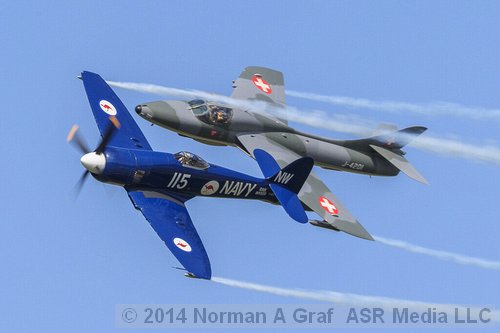 Then it was on to the First World War, with a dozen period aircraft joining up for a mass flyby, followed by a spirited dogfight between the Red Baron’s Fokker Triplane and an RAF SE-5. The historical sequence was interrupted by an aerobatic performance by the Patrouille Reva flying three futuristic AcroEz aircraft. World War II featured the Luftwaffe’s Junkers 52s and Storch aircraft and a segment honoring the Normandie-Niemen Squadron: Free French fighters who fought on the eastern front flying Yak-3s and Yak-11s. The Breitling Wing Walkers, perched atop two bright orange Stearmans flying in formation, provided another aerobatic interlude before the remainder of the Second World War flights. These featured combinations of liaison aircraft, fighters, bombers, and transports. Oddly enough, a recreation of the attack on Pearl Harbor came towards the end of the sequence. It featured a number of AT-6 Texans in the place of the Japanese aircraft (although one had been modified and painted to look like a Zero). Although not quite correct, the action was fast-paced and included a lot of pyrotechnics on the ground with a P-40 taking off during the attack. Stephen Grey, of Fighter Collection fame, flew his final “Joker” flight at this meeting in the F8F Bearcat, retiring at the top of his form. |